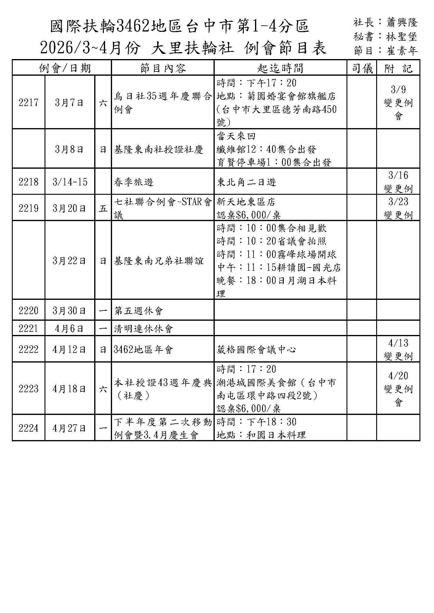 各項例會活動公告